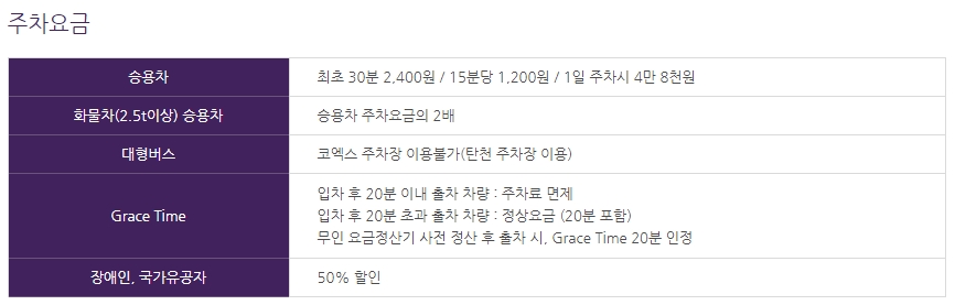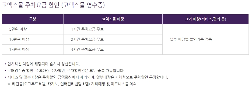 코엑스몰을 이용하는 차량은 코엑스에서 구매를 할 시 주차요금 무료가 적용됩니다.